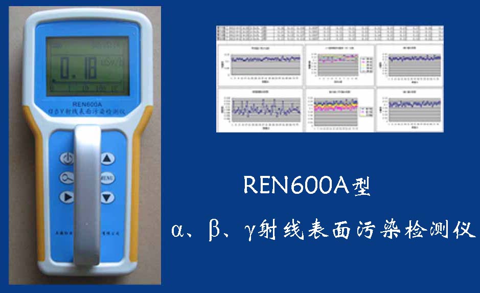 REN600A 表面沾污檢測儀REN600A型α、β、γ射線表面污染檢測儀即可檢測α、β、γ射線,也能檢測到X射線,它采用高速嵌入式微處器作為數(shù)據(jù)處理單元,點陣式大屏幕LCD液晶顯示,讀數(shù)清晰、操作方便,具有400條超大容量數(shù)據(jù)存儲。儀器采用進口的大面積MICA蓋革探測器,具有較高探測效率,可進行α、β輻射表面污染檢測和X、γ輻射劑量率的監(jiān)測。此外通過配套的RenriCont表面污染管理軟件可將存儲的數(shù)據(jù)讀出后分析。可廣泛用在制藥廠、實驗室、發(fā)電廠、進出口商檢、采石場、環(huán)境實驗室、環(huán)境污染調(diào)查、核安全應急、緊急狀況營救站、金屬處理廠、地下油田、供油管道裝備、醫(yī)院核醫(yī)學科、同位素實驗室、環(huán)境保護和警察局等部門。REN600A型α、β、γ射線表面